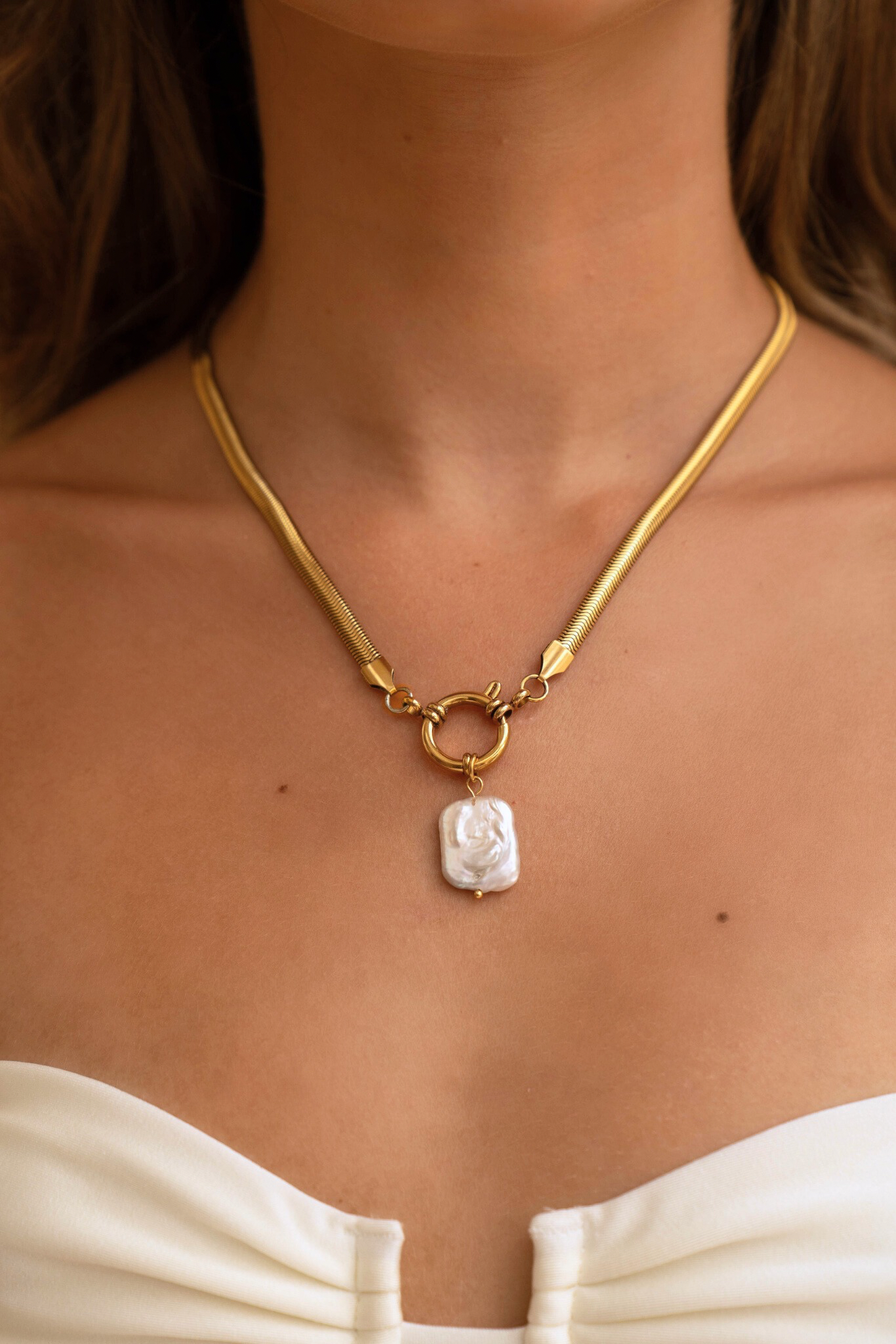 Carefully crafted with 18k gold plating, this stunning herringbone chain design is complimented by a baroque pearl for a truly eye-catching look that’ll have heads turning. Channel your inner ocean goddess with the Ares Pearl Herringbone Chain Necklace.