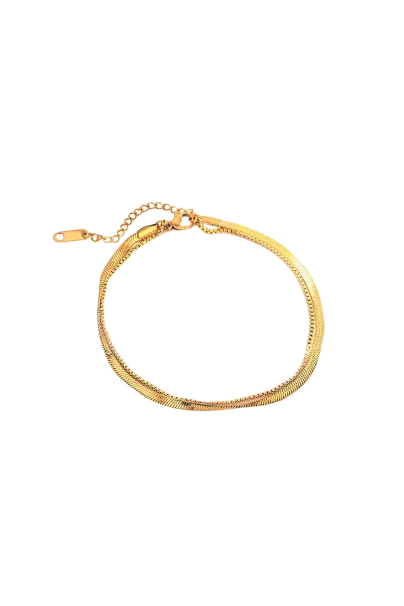 Elevate your look with the Enya 18k Gold Plated Herringbone Chain Anklet. This delicate anklet features a double chain design, exquisitely crafted with 18k gold plating. Elevate any look with this luxurious piece.
