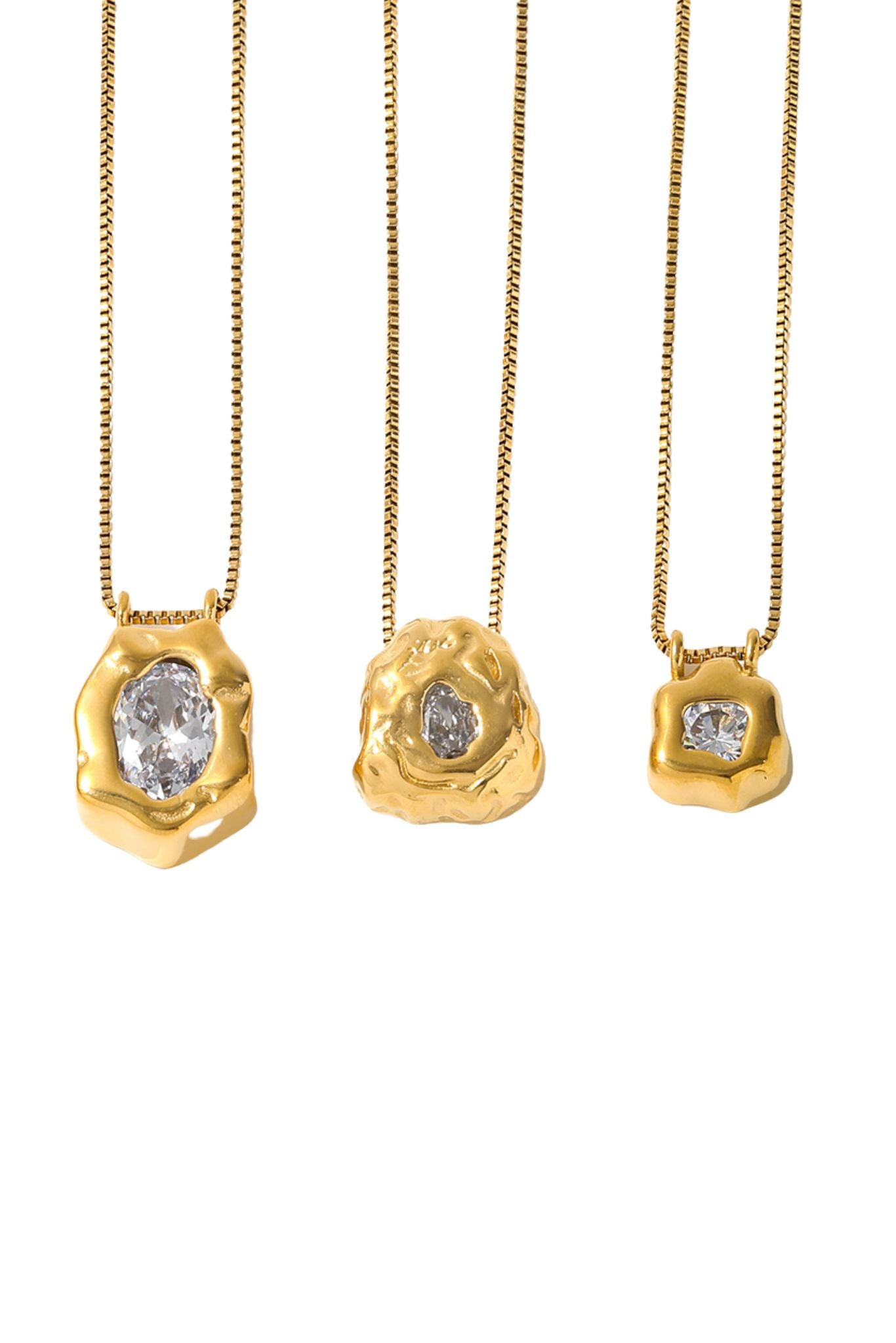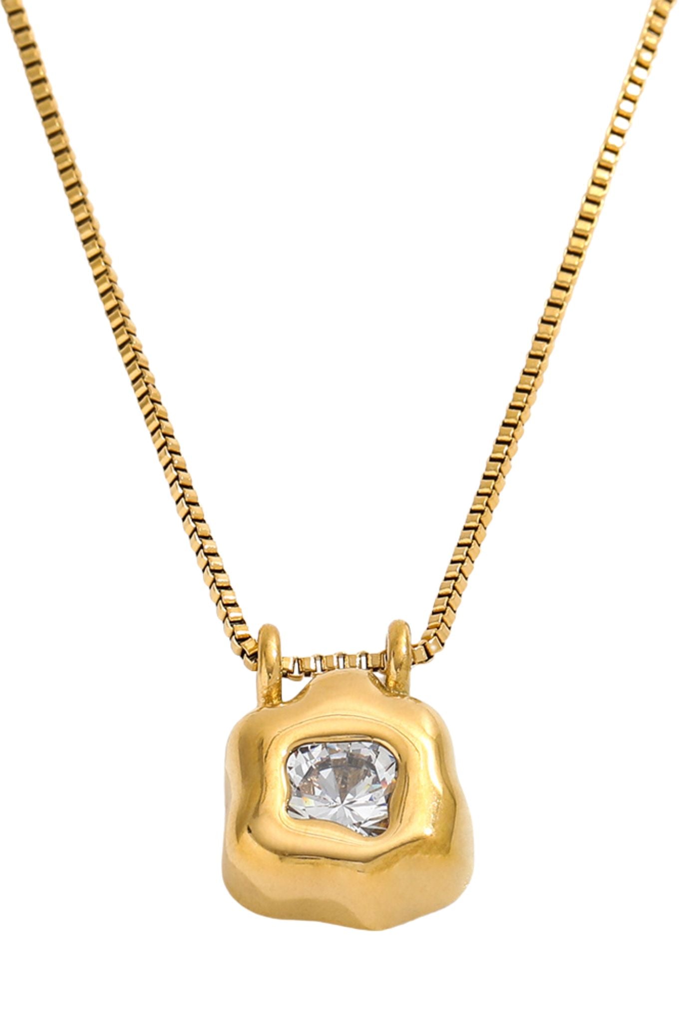 The exquisite small Marra 18k Gold Plated Molten Pendant Necklace will add a touch of luxury to any look. The elegantly crafted pendant, with its molten design, exudes sophistication and exclusivity. Elevate your stack with this delicate and timeless necklace that will surely make a statement.